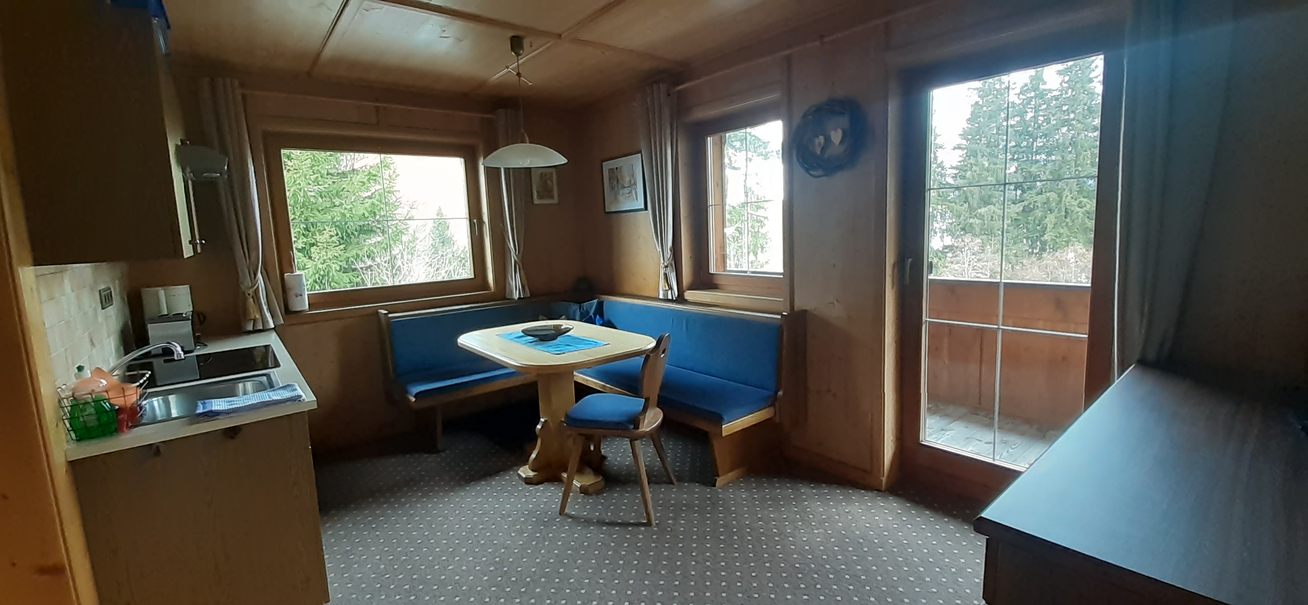 Ein Bad mit Dusche und WC. Küche mit gemütlicher Sitzecke. Balkon mit herrlichem Rundblick, Balkonmöbel mit Sitzauflagen.
